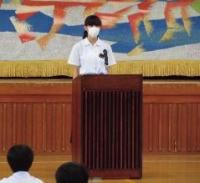 青少年赤十字についての説明の後、学年の代表者が署名し、誓いの言葉を斉唱しました。